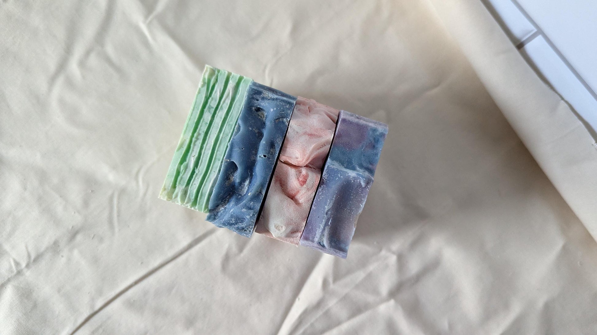 Skin Safe Micas: Mica powder safe for use on skin to color the soap Fragrance: Oils to give an aromatic nature and scent the soap These bars are a great way to cleanse the skin without over drying, and may help soothe irritated skin.
